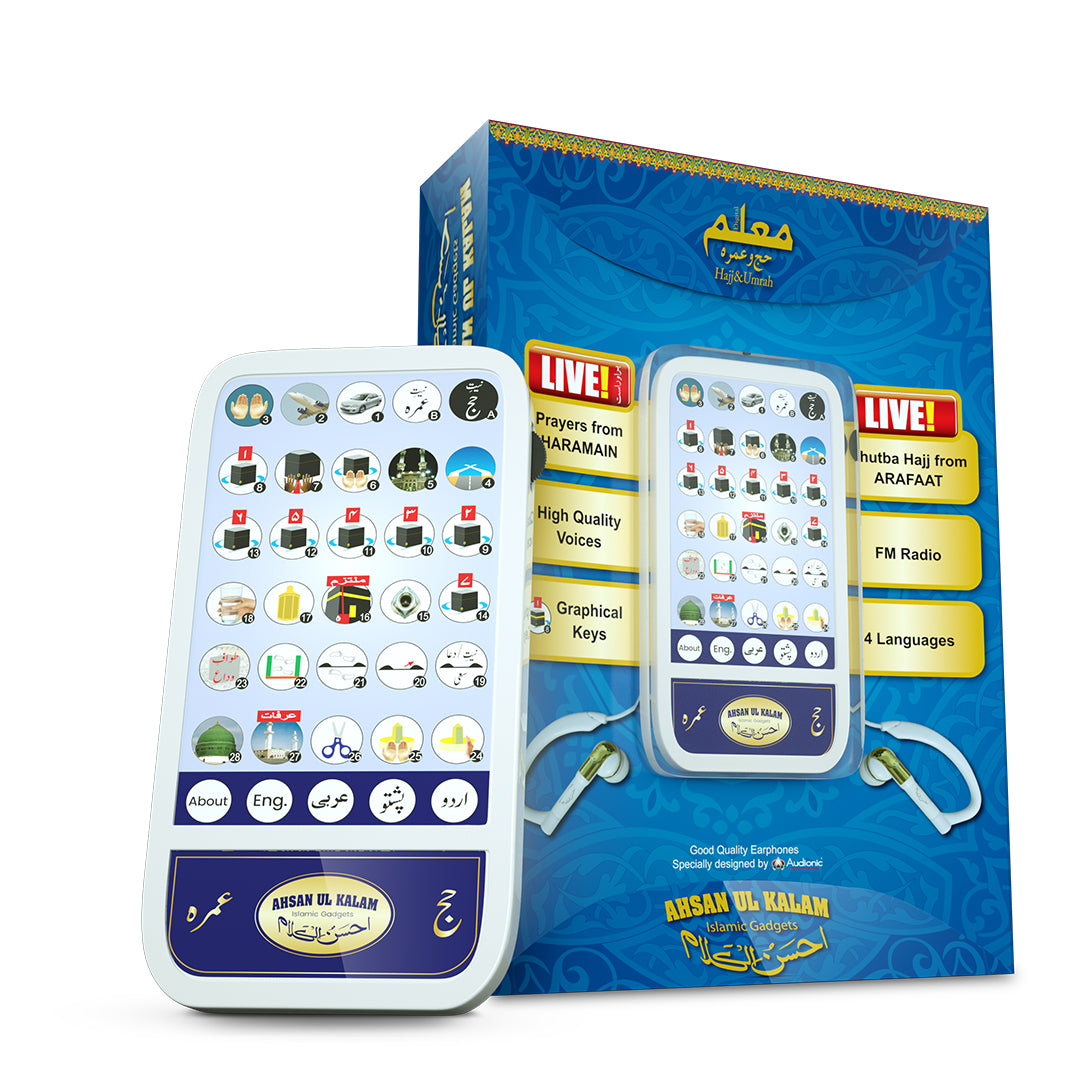 اپنے اعلیٰ معیار کے آڈیو اور بدیہی یوزر انٹرفیس کے ساتھ، معلم حج اور عمرہ ڈیوائس ایک آسان حج کے تجربے کو یقینی بناتی ہے۔ گرافیکل ڈسپلے واضح طور پر دکھاتا ہے کہ کیا دعا پڑھی جا رہی ہے، جبکہ واضح آواز صارفین کو ریکارڈنگ کے ساتھ الفاظ کو دہرانے کی اجازت دیتی ہے۔ حج اور عمرہ کے مسافروں کی ہر ضرورت کو پورا کرنے کے لیے 35 سے زیادہ منفرد خصوصیات شامل کی گئی ہیں۔ گائیڈز سے لے کر دعاؤں اور دعاؤں تک، ایف ایم ریڈیو تک براہ راست نشریات، یہ عمرہ ڈیوائس سب کچھ پیک کرتی ہے۔